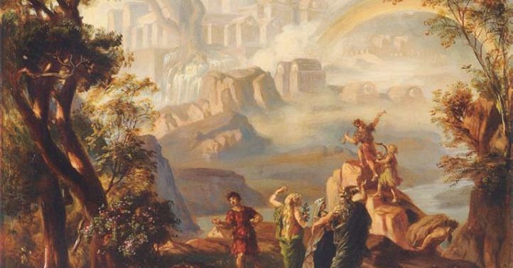 众神之王沃坦(Wotan)让巨人法索尔特(Fasolt)与法夫纳(Fafner)建造象征统治权力的瓦尔哈拉(Walhall)神殿,报酬是青春女神弗莱娅(Freia)。弗莱娅守护著种满金苹果的花园,众神吃了可永保青春。