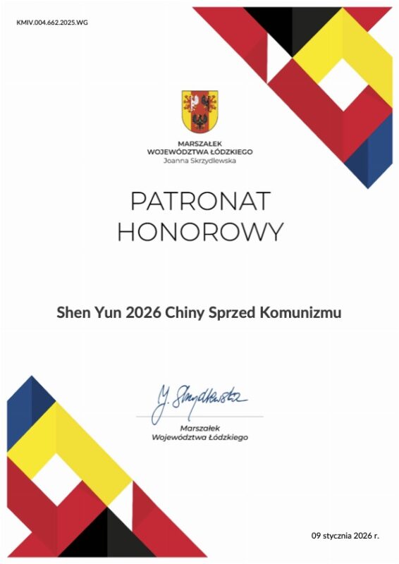 波兰罗兹省长荣誉赞助神韵演出。证书写明:荣誉赞助,神韵2026:共产主义之前的中国。(罗兹省长提供)