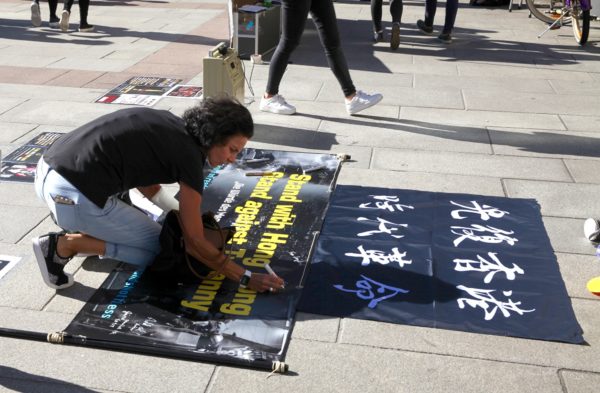 2019年9月29日,香港留学生、港侨等各界人士在慕尼黑玛琳广场集会,声援香港民众反极权的运动。图为鲍泽议员签名声援香港民众。(黄芩/大纪元)