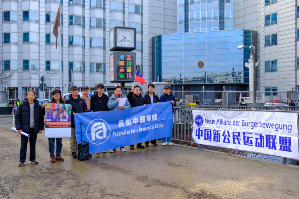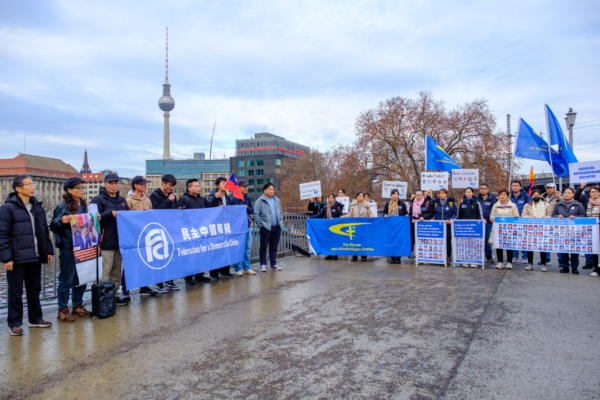 2025年12月10日国际人权日,德国多个团体在柏林中共使馆前举行抗议活动,呼吁推翻中共暴政。(张清飖/大纪元)