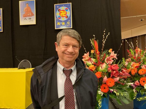 2025年12月27日,法轮功学员Boris Suchin向李大师拜年。(余平/大纪元)