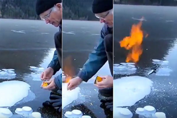 男子点燃湖上的可燃冰。(视频截图/大纪元合成)