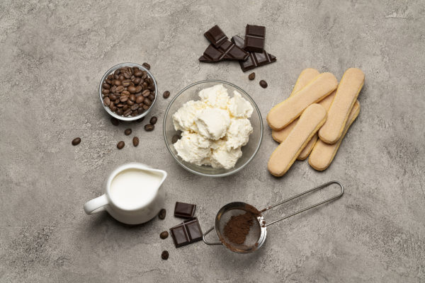 准备制作提拉米苏的材料:咖啡豆、生巧克力豆或巧克力粉、鲜奶油、手指饼干、马斯卡彭乳酪、糖、利口酒、糖粉、水 。(shutterstock)