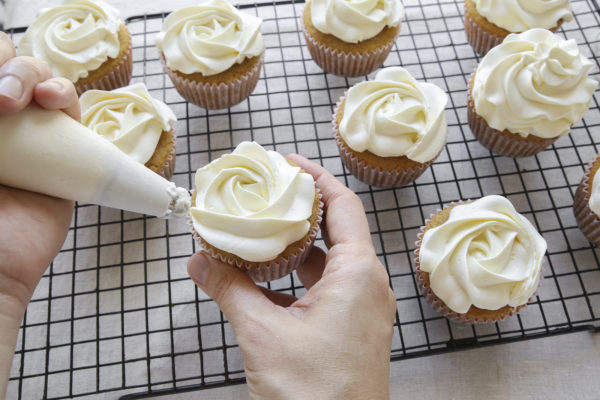 等香草杯子蛋糕体冷却后,才在上方挤上奶油糖霜。(shutterstock)