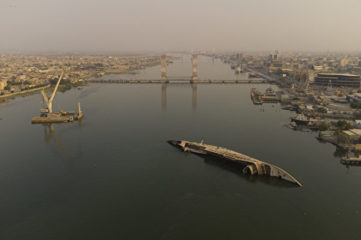 在伊拉克南部城市巴士拉(Basra)的阿拉伯河航道上,翻覆着一艘萨达姆‧侯赛因…
